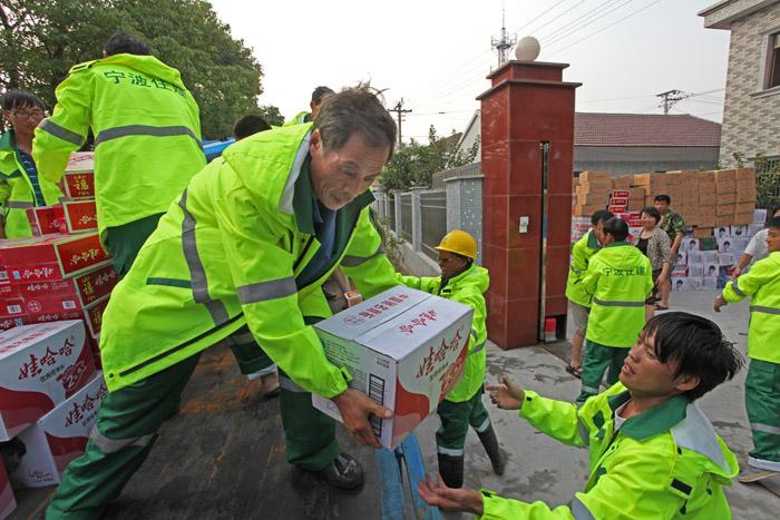寧波住宅建設(shè)集團(tuán)應(yīng)急救援隊(duì)把餅干、八寶粥、礦泉水等救災(zāi)物資運(yùn)...