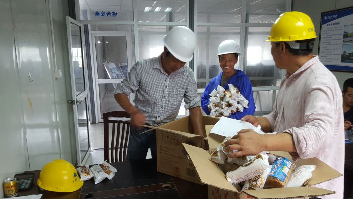 發(fā)月餅的時(shí)候,一位帶班拿著剛剛領(lǐng)到月餅高興的說:“感謝領(lǐng)導(dǎo)、感謝公司對(duì)我們無微不至的關(guān)懷,夏天送清涼,節(jié)日送祝福,讓我們從心里感受到了家的溫暖,有了回家的感覺。”項(xiàng)目負(fù)責(zé)親切地對(duì)大家說:“兄弟們,辛苦你們了!不能回家和家人團(tuán)圓,在現(xiàn)場(chǎng)你們一定要注意安全, 你們的平安就是給家里最好的消息,大家要開開心心工作,快快樂樂過節(jié)!”