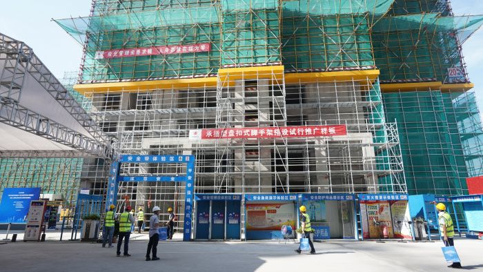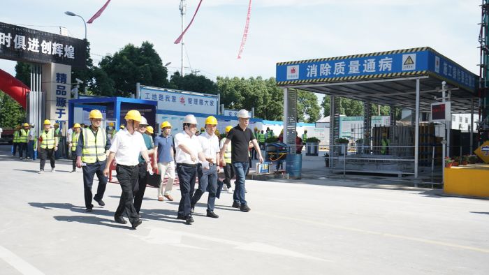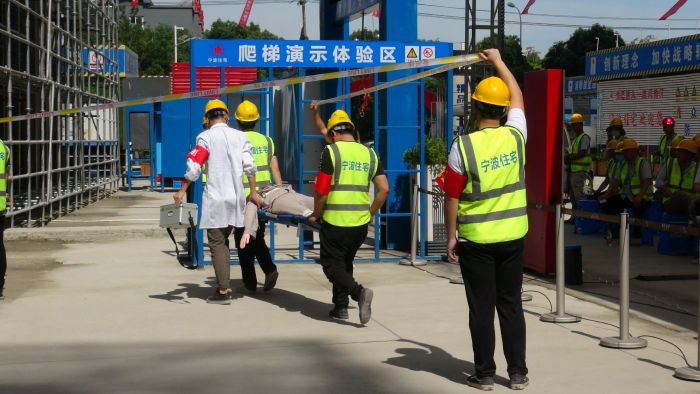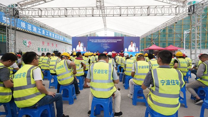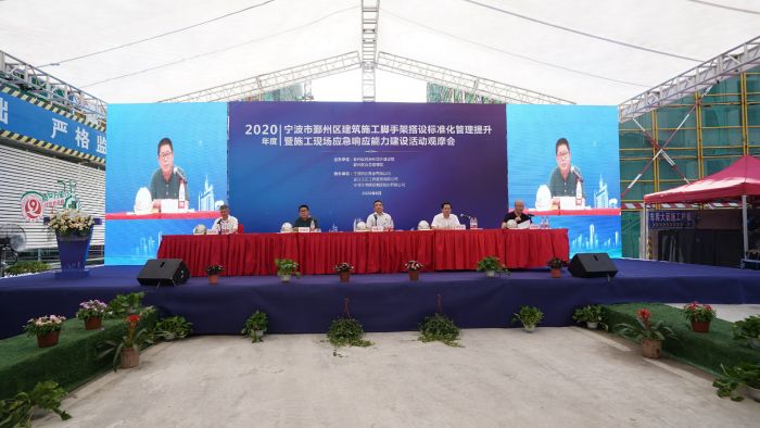 一一寧波住宅建設(shè)集團深入開展第19個全國“安全生產(chǎn)月”活動,于2020年6月17日上午在鄞州區(qū)明月江南項目現(xiàn)場舉行建筑施工腳手架搭設(shè)標準化管理現(xiàn)場提升暨安全事故應(yīng)急響應(yīng)處置演練觀摩會,旨在加強建筑工程安全生產(chǎn)工作,通過示范引領(lǐng),推動企業(yè)安全主體責任的落實,提高建筑施工標準化管理水平以及安全事故應(yīng)急救援水平和能力。鄞州區(qū)住建局、應(yīng)急管理局以及部分建設(shè)、監(jiān)理、施工單位、新聞媒體等共300余人參加會議。本次觀摩會內(nèi)容豐富,突出智慧工地,重點展示腳手架搭設(shè)標準化流程,推廣盤扣式腳手架,其他包括定型化安全防護用具、VR安全體驗教育、BIM技術(shù)、揚塵防控設(shè)施以及高處墜落事故應(yīng)急演練等等。