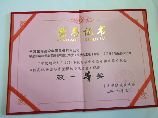 2014年3月20、21日在“寧波建設(shè)杯”2014年優(yōu)秀質(zhì)量管理小組成果發(fā)表會(huì)上,大工業(yè)供水工程Ⅰ標(biāo)段(過江段)項(xiàng)目部QC小組,《提高沉井圓形井壁模板安裝質(zhì)量》課題獲“一等獎(jiǎng) ”。