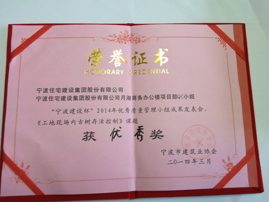 月湖商務(wù)辦公樓項(xiàng)目部QC小組,《工地現(xiàn)場(chǎng)內(nèi)古樹存活控制》課題獲“優(yōu)秀獎(jiǎng)”。